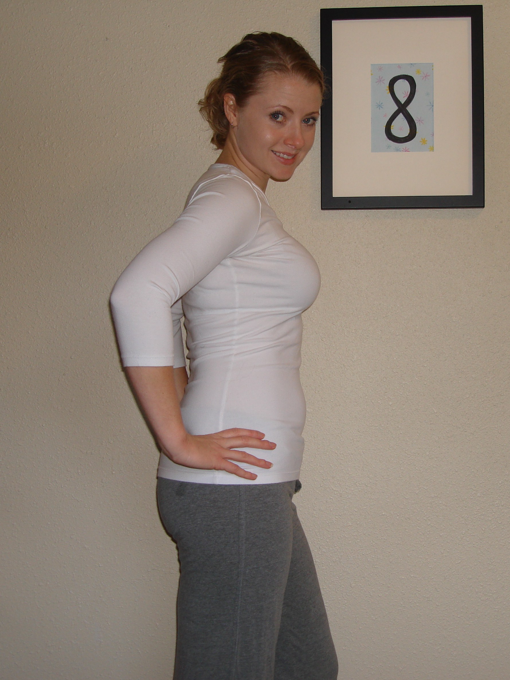Symptoms: Getting more and more bloated. I can’t wait until it’s actually a baby bump and not this “blump” nonsense. You may notice, I’m wearing different pants in this week’s photo than in previous ones. I had planned to wear the same outfit for all of my weekly pictures, but my black yoga pants were already getting kind of tight, so I decided to switch to a pair that have a better shot of lasting me for a while longer! Interestingly, I’m still down a couple pounds from my pre-pregnancy weight. So while I’m eating more and looking pudgier around the middle, I’m not actually gaining any weight. Seems odd, but I’m not complaining. There’s plenty of time for weight gain.