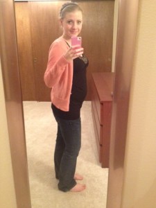 I met up with a friend for lunch on Saturday and she lent me all her maternity clothes, which is awesome! I also bought myself a couple things this weekend, so I finally feel like I have more to wear that fits me appropriately. Some of the stuff I borrowed is still too big or just looks frumpy without a belly to fill it out, but I’m sure I’ll appreciate that stuff when I’m bigger. I’m wearing a couple of the borrowed items today, including maternity jeans, a maternity top, and then my own cardigan over it. Feeling pretty comfortable. I can already see that it may be hard to give up the elastic band pants after I have the baby!