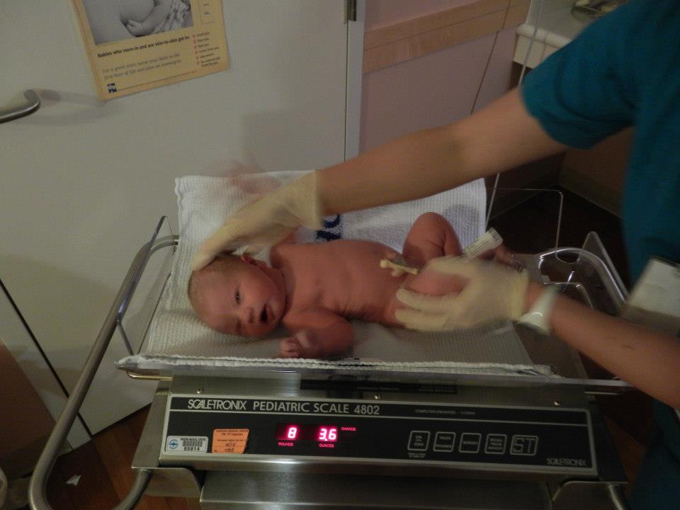 The doctor arrived about 5 minutes later, and then spent an additional 5 minutes putting on what looked like a hazmat suit. Finally she was ready, and about three pushes later, Theo was born. He came out screaming mad – my first vision of him was his face coming toward me as the nurse handed him to me with his mouth wide open, screaming his head off, lower lip quivering. I love that lower lip quiver and it makes it hard to get frustrated with him when he cries because it is just so darn cute. Despite D’s squeamishness with the birth, he was right there with the camera as soon as Theo was out. One thing we both noticed was that he was not as gross looking as some babies are when they are first born. Yeah, yeah, I know. All parents probably think that. But really, despite some massive cone head from being in the birth canal for so long, he was otherwise a very cute baby right from the start. His skin was pink, not gray, and he wasn’t covered in vernix like many babies are. The nurse put him on my chest, skin-to-skin, where we stayed for the first hour of his life. They were able to clean him off while he was on my chest, and we got to try breastfeeding (wasn’t terribly successful, though we’re doing great now). I was so enamored with him that I was only vaguely aware some time later that the doctor was stitching me up. I asked her if I tore badly and she said it was a second degree tear in two places, along with some “abrasions” that wouldn’t need stitches but might cause me some pain. D and I looked down at Theo’s already long nails and D surmised that he was probably clawing his way out (ha). About this point I realized that I hadn’t even noticed that I had delivered the placenta. For some reason I had pictured that feeling like a second birth, but I hadn’t even noticed it happening. After an hour of snuggling our new baby, they took him to the other side of the room to take his measurements and give him his first vaccines.