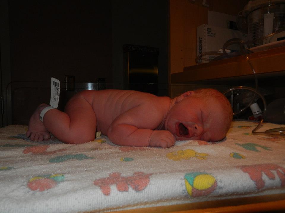 The other thing about pushing that I hadn’t anticipated was that it takes a really long time! For over 2 hours I pushed three times with every contraction, with about a minute of rest in between. It was incredibly exhausting, but I was working as hard as I possibly could. I wanted this baby out already! I kept remembering what the nurse had said about not “fearing the poop” and I really do think it helped me to push effectively and without inhibition. To this day I have no idea whether I did or not, but the point is that I didn’t care. Not one bit. Funny how of all the things that were going through my head during this time pushing, the one that stands out the most for me is just how hungry I was. I hadn’t been allowed to eat anything since about 8 a.m. that morning and I was working harder than I’d ever worked in my life. I felt so weak. Then again, I can see why they don’t want you to eat, because I ended up throwing up during my first several pushes (between pooping and puking, giving birth really isn’t very glamorous). The nurse said the vomiting is very common, and I’m glad there was nothing in my stomach besides water to throw up.