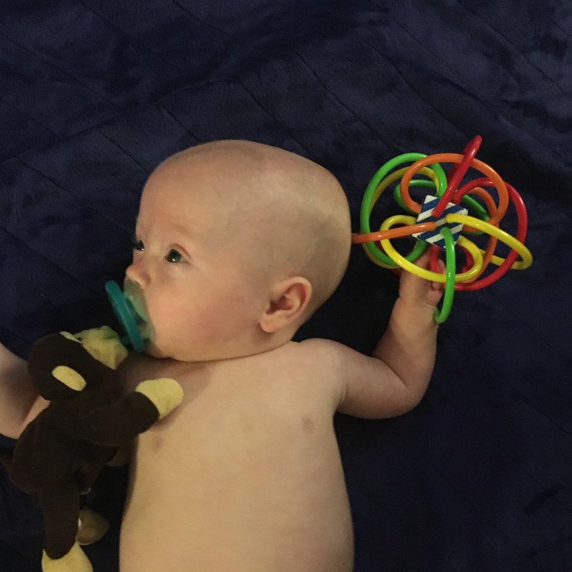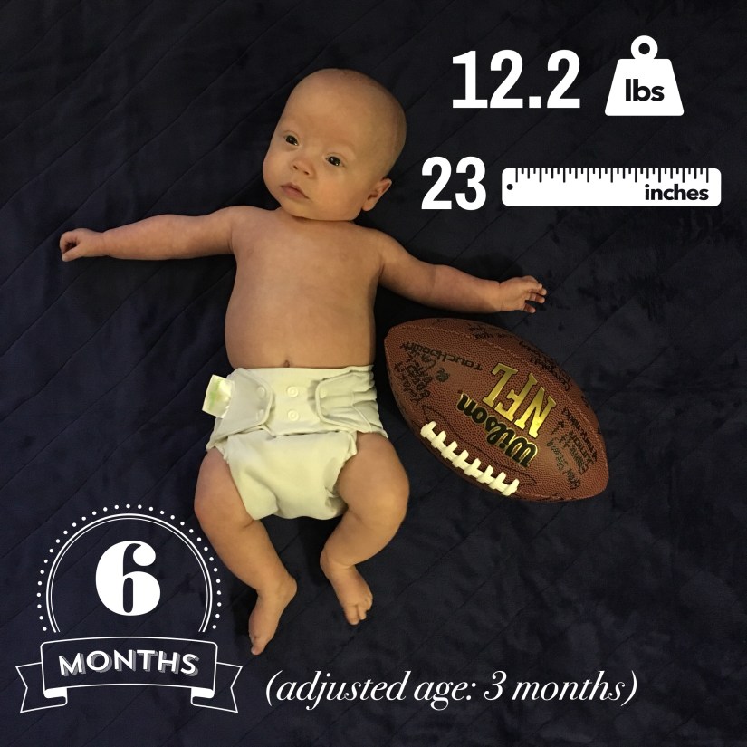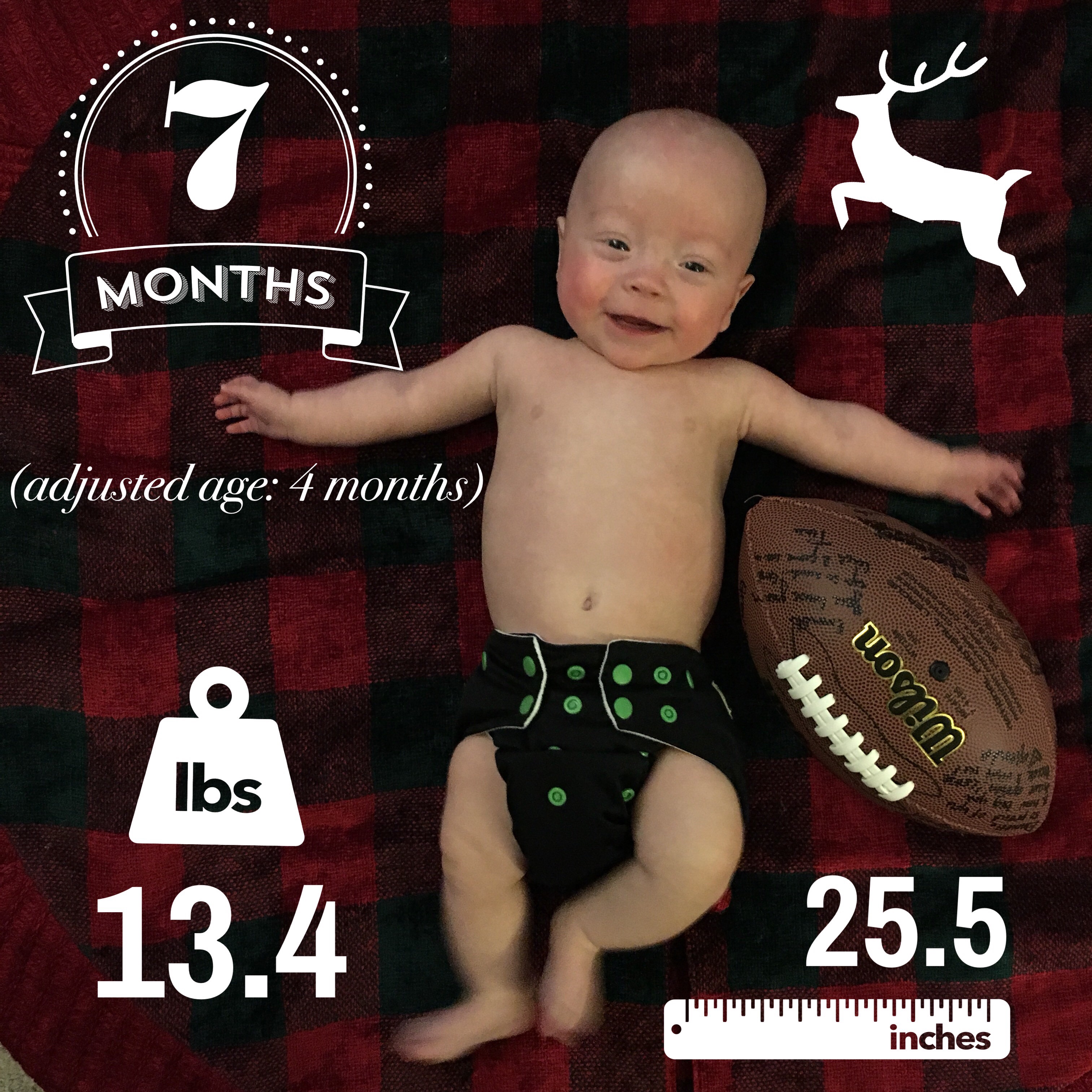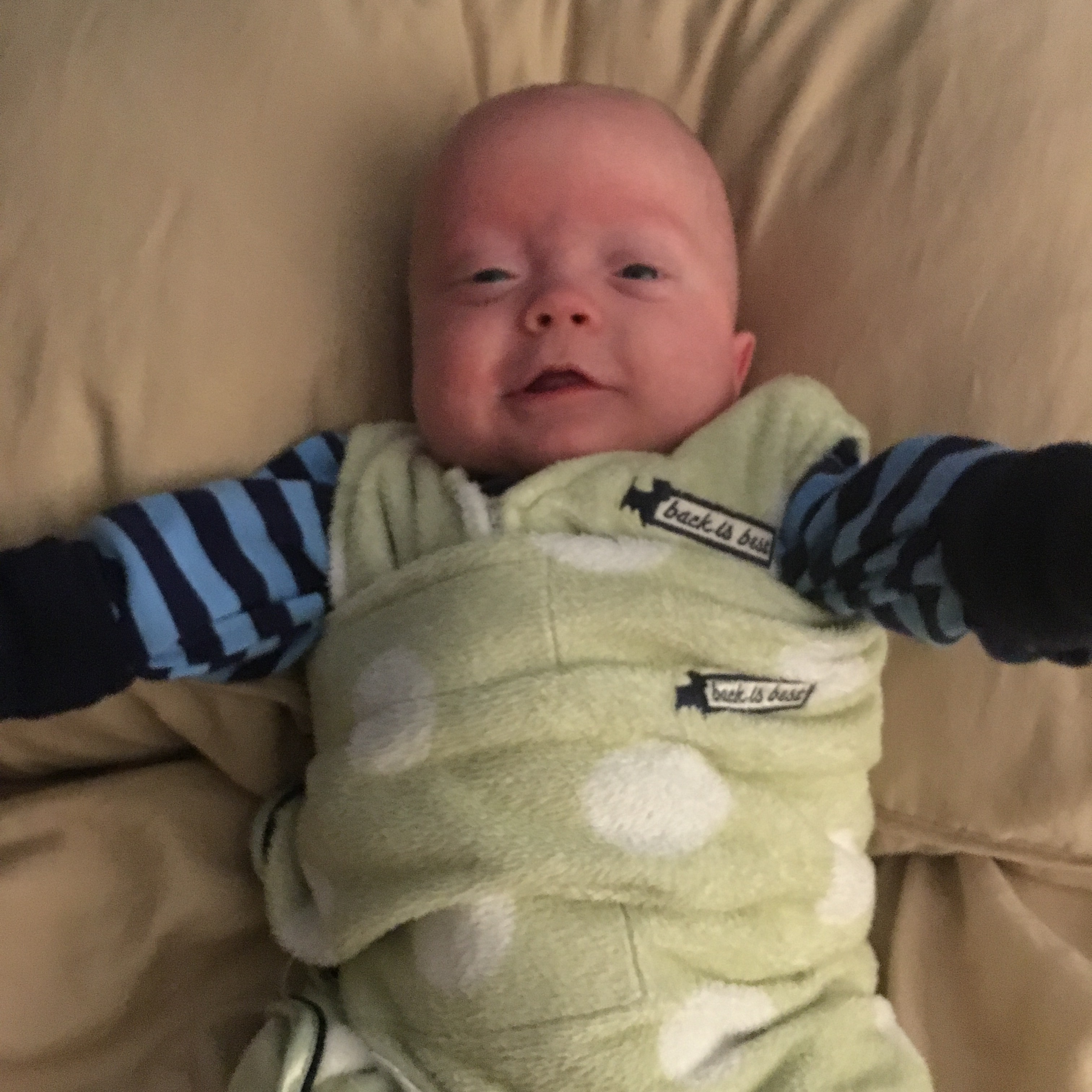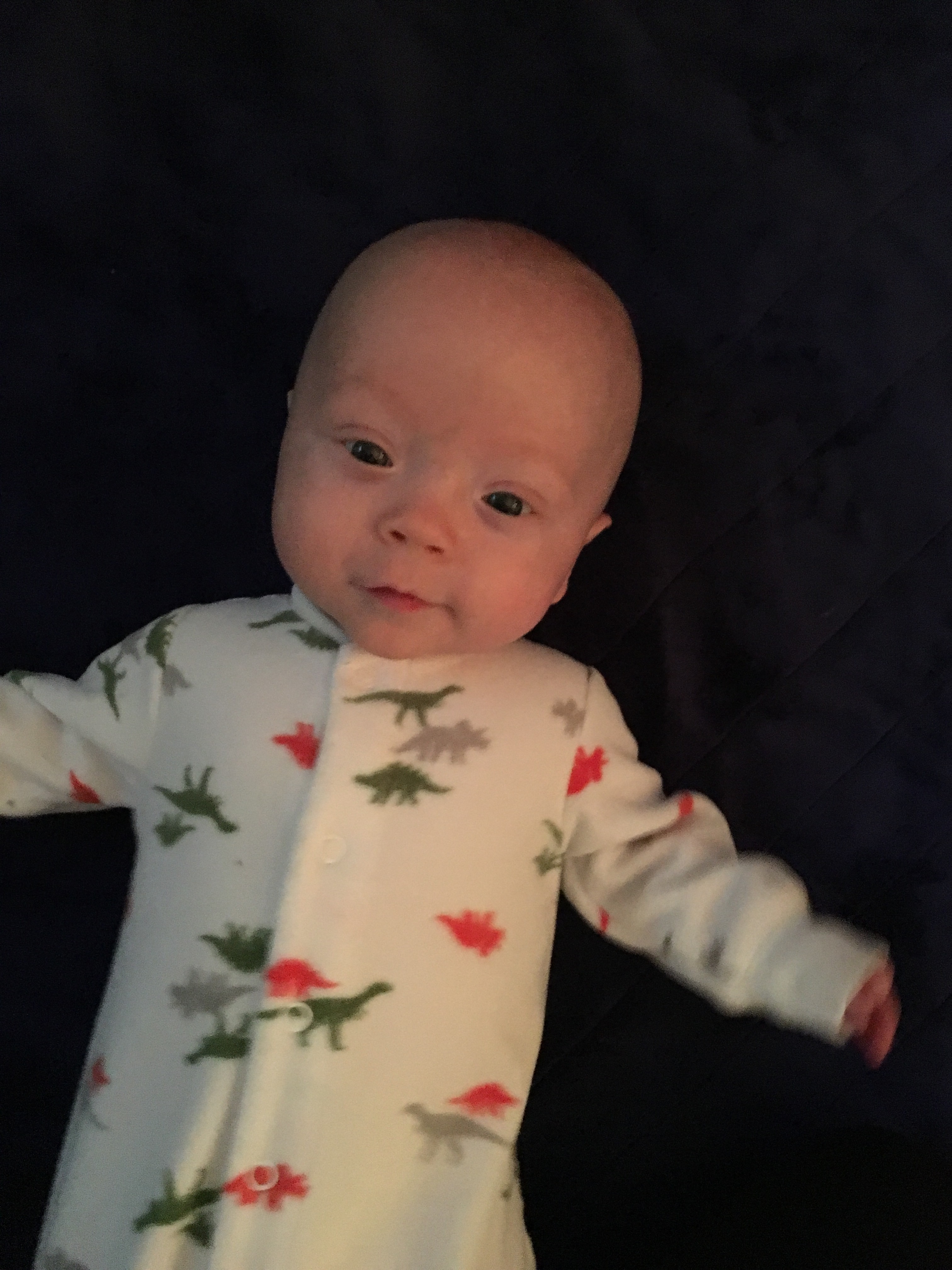 Eating: He’s doing three solid meals per day now, plus an afternoon snack. Not as interested in nursing these days and is pretty easily distracted, but we’re still trying to get bottles/nursing sessions in him every 3 hours since he needs the calories and breastmilk is more calorie-dense than the solid food he’s getting. Still adding avocado, butter or full-fat yogurt to his purees. Gotta fatten this peanut up!