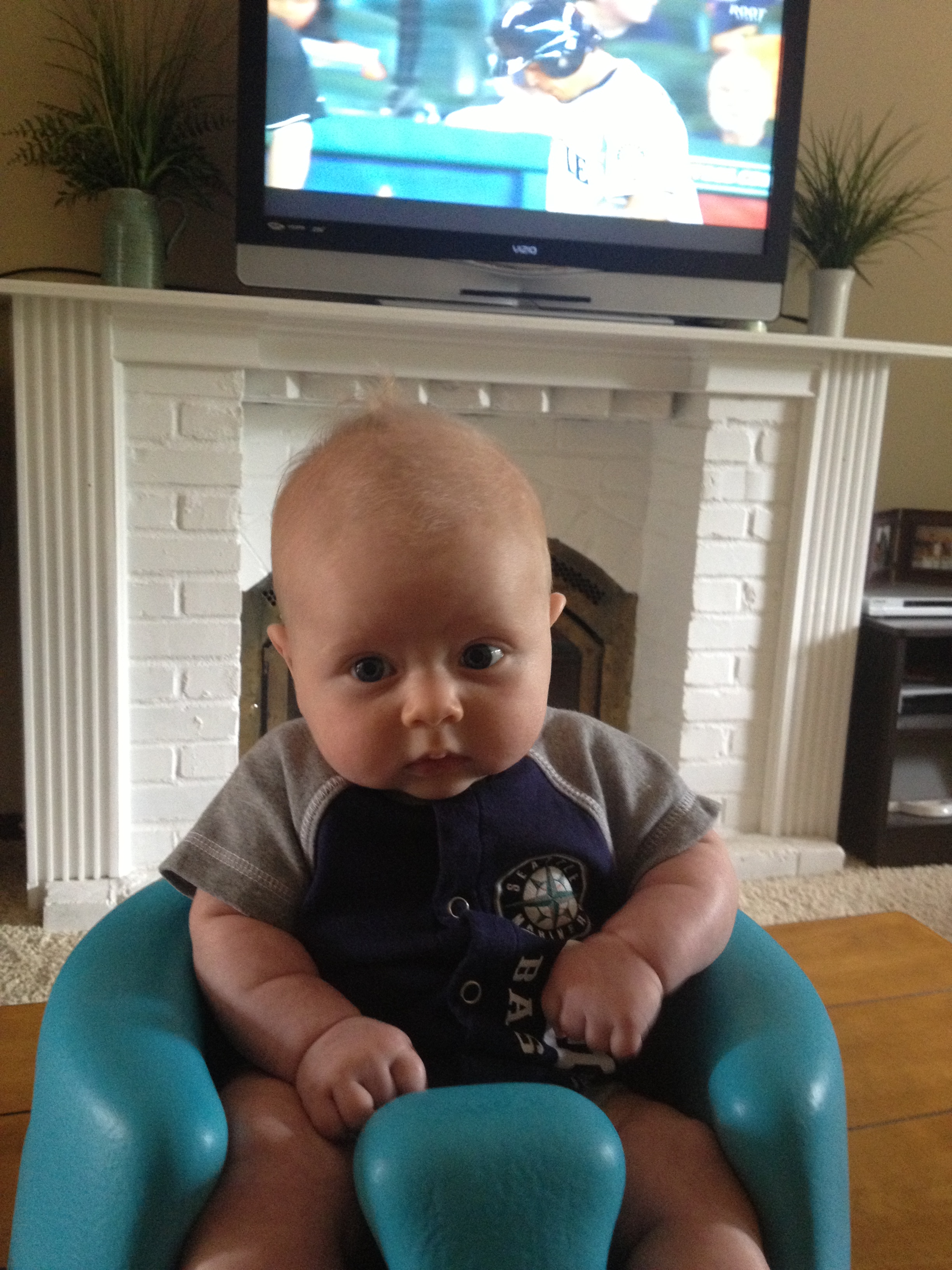 Likes/Dislikes: Still loves being changed, and loves bath time too. He prefers to look around and be upright most of the time. We put him in his Bumbo chair for the first time a couple weeks ago, and he loved it! He used to love his swing, but he seems to be falling out of love with it, and I think it’s because he’s too reclined to really look around. He’ll still nap in it when he’s really tired, but forget about using it to calm him when he’s fussy. The swinging motion used to calm him right down, but now putting him in the swing while he’s fussing will make him quickly escalate from fussing to screaming. He is starting to like his crib more, even though he still doesn’t sleep in it. He likes to look up at his mobile, though, and sometimes I’ll put him in there while I hang clothes or tidy up his room. Lately he’s been going through a phase where he just wants to be held most of the time (upright, of course). He’ll fuss if you set him down, or even sit down while holding him, but if you’re standing and he’s able to look over your shoulder, he’s happy as a clam. I’ve been watching a lot of TV while standing up lately…