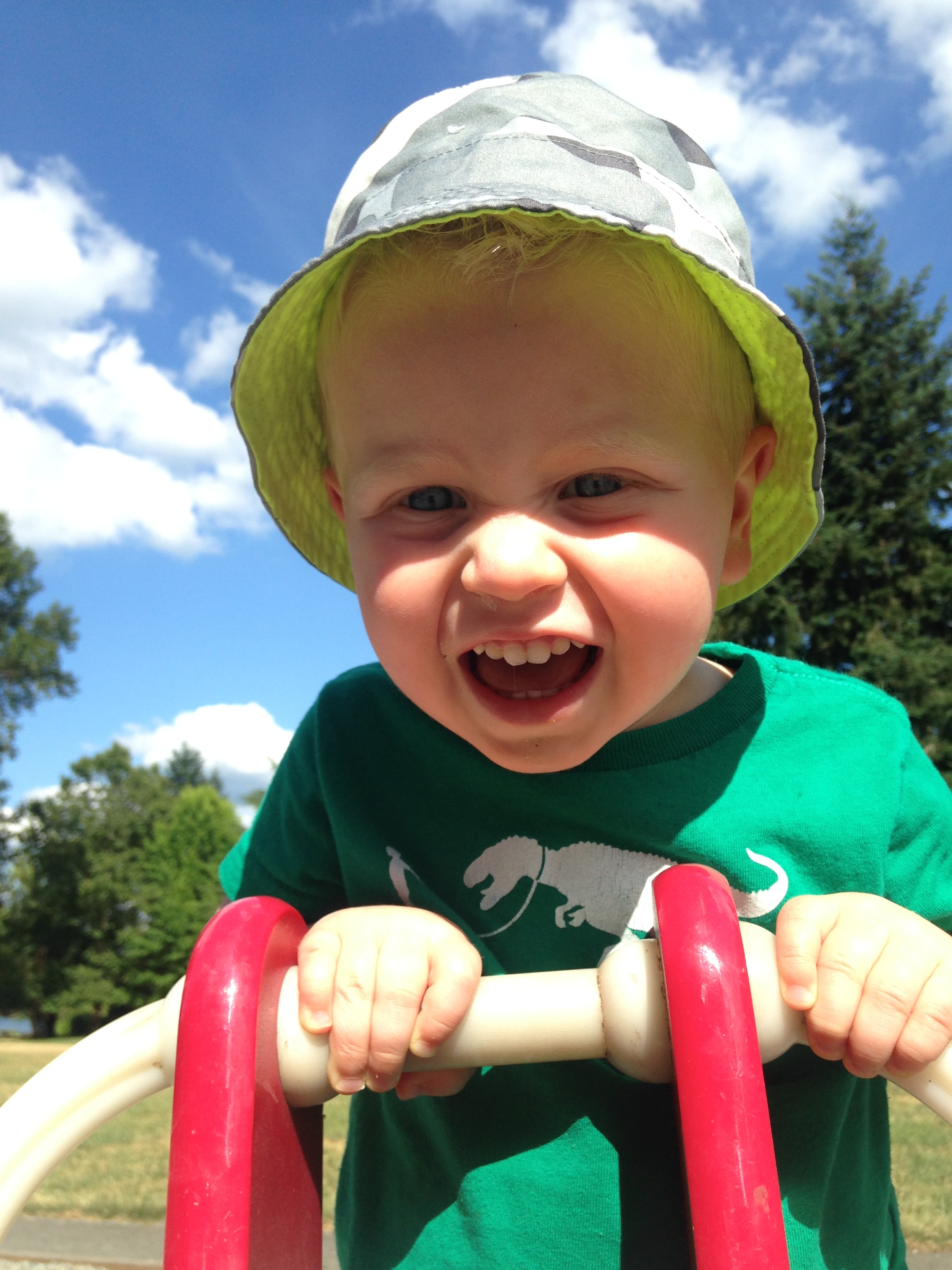 Other things: he loves to be chased and tickled and will scream for us to stop and once we do, begs us to chase or tickle him again. He has an infectious laugh and a great smile, but when you ask him to smile on command, this is what he gives you: