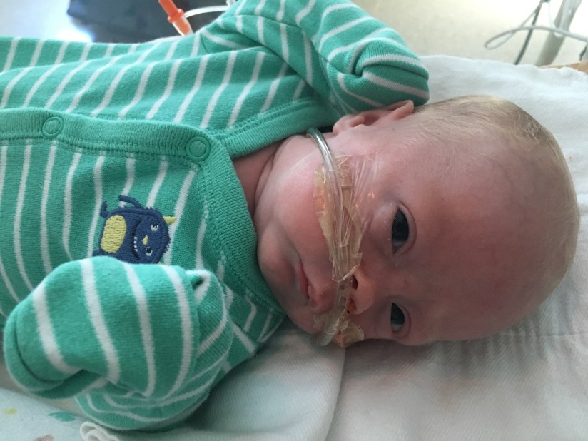 The biggest milestone today: they removed his breathing tube! That’s a huge step in his journey toward breathing on his own. The problem was, he still needed some assistance, and the team determined a CPAP (like what adults with sleep apnea use) was the way to go — and Emmett HATED it. It was too much air pressure for him, so every time he would get a puff of air from the CPAP through his nose, he would open his mouth in reflex and chuff out some of that precious oxygen. This caused the oxygen sensors to go berserk every couple minutes and made it sound like he was crashing. Even though the nurse and RT assured me he was fine – that he just needed to get used to it and that the alarms were just overly sensitive, the sound of all those alarms was just so unnerving, and in my sleep deprived state (3 hours last night and 4 the night before), it was simply too much for me to handle. Emmett was flailing around in protest, alarms were going off left and right, and I broke down sobbing. This went on for a couple hours. They even put a chin strap on him to keep him from letting all the air out his mouth, but then his face just looked smooshed and he was still fighting the machine. Finally, the team determined he was expending too much energy fighting and tried a nasal cannula instead of the CPAP. It was like an instant calm came over the room and things have been better ever since. I swear, I’m going to be hearing that damn alarm in my nightmares. D joked that E will probably need it to fall asleep once we take him home.